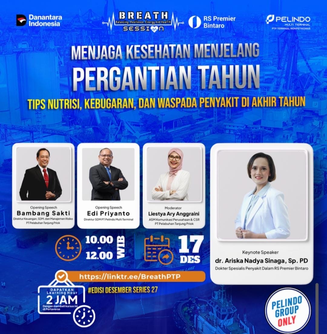 PT Pelindo Multi Terminal (SPMT), Subholding PT Pelabuhan Indonesia (Persero) yang bergerak di bidang operasional terminal nonpetikemas, menegaskan komitmennya dalam menjaga kesehatan para karyawan Pelindo Multi Terminal Group menjelang akhir tahun dalam kegiatan BREATH Session Edisi Desember Series 27 dengan menghadirkan Dr. Ariska Sinaga, SpPD, Dokter Spesialis Penyakit Dalam RS Premier Bintaro pada Rabu (17/12).